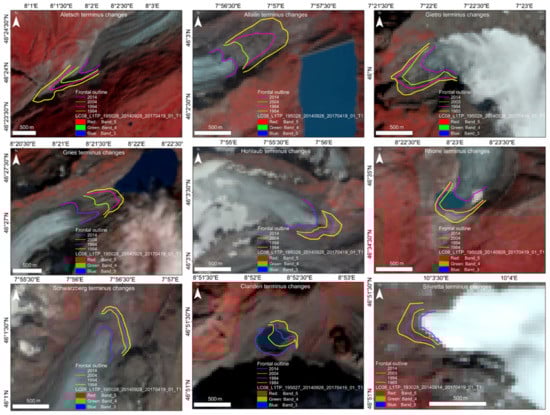 To observe the glacier termini changes over a period of three decades (1984–2014), we use 12 Landsat 5 Thematic Mapper (TM) and Landsat 8 Operational Land Imager (OLI) images downloaded from EarthExplorer data portal []. The images are selected if they are completely cloud-free over the termini of the glaciers and show least seasonal snow cover for the selected timeframe. The collected images are then spread across a 10-year time interval, except for Gietro (Table 2), due to the unavailability of cloud-free coverage of its terminus within the same years as for other glaciers.