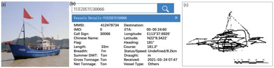 Collection process for the Automatic Identification System sample dataset. (a) Details of a trawler named YUEZHUYU30066 were obtained from the website of Ningbo Dajiang Shipbuilding Co. Ltd (http://www.nbdjcy.com/content/?828.html (accessed on 5 May 2021)). (b) The MMSI number of the trawler was identified through the fishing vessel query website of China Ports Net. (c) The ship’s activity track in April 2018 was derived from the AIS database based on the MSSI. It should be noticed that the trajectories of all three types are shown in the Figure 6.