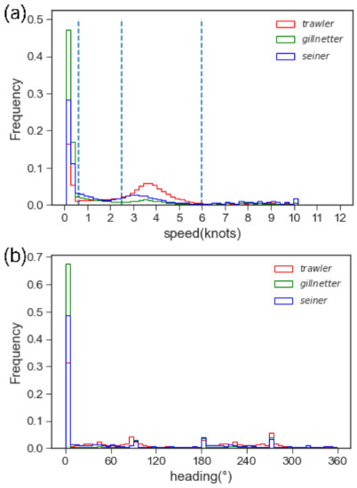 Frequency histograms of speed (a) and heading (b) for trawlers, gillnetters and seiners.