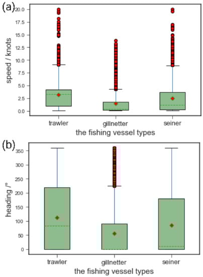 The continuous speed and heading changes of different fishing vessel types showed different characteristics, but were similar for the same fishing vessel type [32]. We analyzed the AIS trajectory data in the sample dataset separately, according to their categories, and plotted the frequency histograms and box diagrams of speed and heading for the different types of fishing vessels.