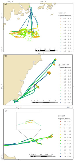 Fishing trajectory of a trawler (a), gillnetter (b) and seiner (c), where different colors are used to indicate speed intervals.