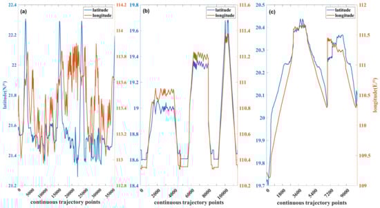 To further explore the characteristics of the position changes of the three fishing vessels during fishing operations, the change curves of the latitude and longitude values in the AIS data were plotted (Figure 7). Because the trajectories generally showed continuous east-west or north-south variations, the longitude of the trawler was more variable, random and irregular compared with the latitude in (Figure 7a). Figure 7b,c, show that the changes in longitude and latitude were more synchronized for gillnetters and seiners, especially for gill net vessels. However, compared with the other vessels, the fishing sites of the gillnetters were more scattered.