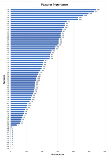 where γ is regularization on the additional leaf, and Gain records the number of times each feature causes the classification tree to split, which is an indicator of the feature’s contribution to the classification. Then, we sorted the 72 features according to their importance scores, as shown in Figure 8.