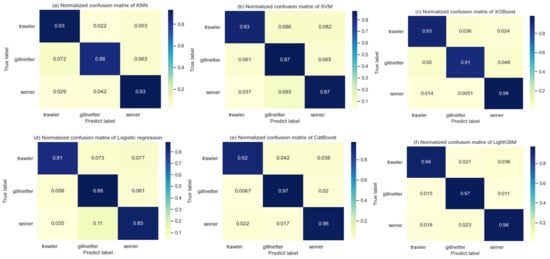 We found that features F43–F48, related to the speed (6 knots, 12 knots), and features F67–F72, related to the displacement (3.1 m, 6.2 m) had relatively low importance, and hardly contributed to the classification. This was due to the fact that when the speed and displacement were in these two groupings, the fishing vessel was sailing at high speed and there was no significant difference in the behavior of all fishing vessel types in this state. Therefore, we removed features F43–F48 and F67–F72 and calculated the other features for each fishing vessel from the AIS trajectory data, generating a 60-dimensional feature vector. This feature vector was fed into the tuned LightGBM model, and the three classifiers were trained for three types of fishing vessels. For the vessels to be classified, each classifier generated the probability that the fishing vessel belonged to the corresponding type, and then identified the fishing vessel as the type with the highest probability.