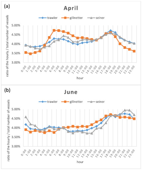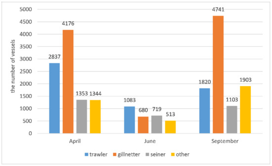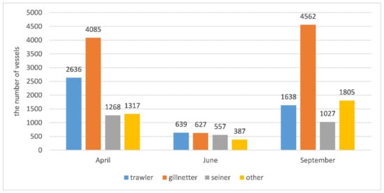 Figure 17 shows the number of Chinese trawlers, gillnetters and seiners per hour operating in the northern SCS. There was no significant difference in the trend of the hourly number of the three types. Additionally, since the trawlers and gillnetters operate throughout the day, while the lighted seiners use the light trapping method to catch marine fish at night, the hourly number of the three types were less affected by day and night. However, it is obvious from Figure 17 that there are two peaks: at 6:00–7:00 and 18:00–19:00. This is attributed to the fact that fishermen are mostly concentrated in these two time periods when they go to sea and return to port. Furthermore, there were more fishing vessels in the daytime in April and September, which were the legal fishing months. Fishing vessels operating at night accounted for a large proportion of the total number in June and were more concentrated in the first half of the night.