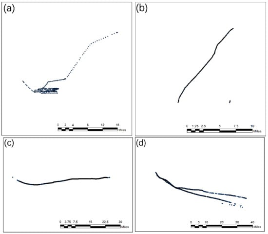 Significant differences in the trajectories of different types of fishing vessels were observed (as shown in Figure 6). Trawlers mainly relied on sailing to drag the fishing gear. During a single operation, the trawl was generally towed in one direction, so the trajectory showed continuous changes of direction over a short time. Figure 6a clearly demonstrates that the trajectory of this trawler was crisscrossed east-west, and the fishing site was relatively large but concentrated. The working locations of gillnetters were generally far away from port and not continuous in space. During fishing, the operation track of gillnetters was relatively straight and tight (Figure 6b). For seiners, Figure 6c shows that their fishing areas were usually far from port, and the operation was carried out by a single vessel releasing the net and then returning to the origin, so a single operation trajectory of a seiner resembles a closed loop.