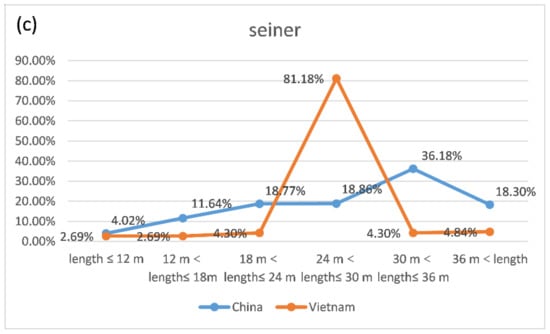 The purse seines of seiners are horizontal nets that are deployed to hang vertically from floats around schooling fish on or near the surface by the vessel or by a separate skiff [41]. During the operation, the net surrounds a dense school of fish, forcing the fish to enter the fishing capsule of the net, and the net is pulled in to catch fish. The schematic diagram of a seiner is shown in Figure 2c.