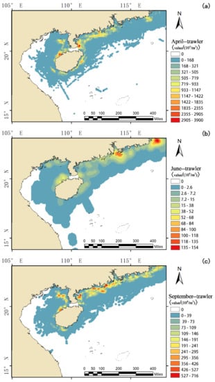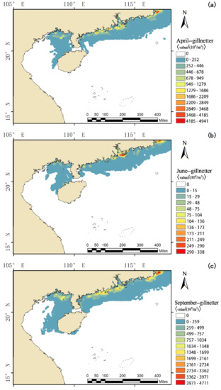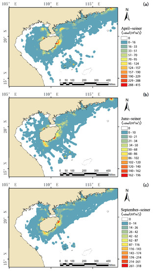 To study the seasonal activity pattern of fishing vessels in the northern SCS, April (spring), June (summer) and September (autumn) were selected as typical months for analysis. In April, the gradual increase in the water temperature leads to vigorous fish growth and fishery resources are abundant in the SCS. In June, the Chinese fishing season is closed in the northern SCS. According to Chinese law, from 12:00 a.m. on 1 May to 12:00 p.m. on 16 August, all types of fishing vessels except vessels with fishing tackle, as well as auxiliary vessels that provide support services for fishing vessels, are required to remain ashore. September is the peak season for fishery production, following the growth of juvenile fish in the closed season.