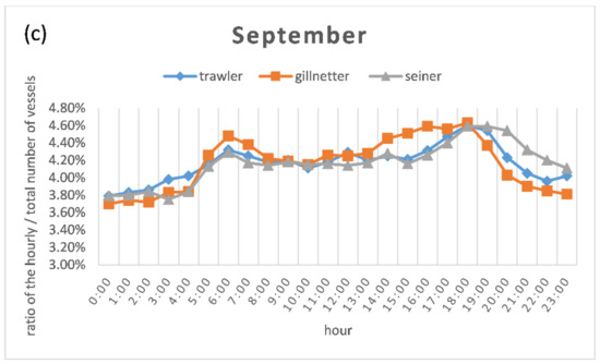 Statistics for Chinese fishing vessels per hour in April (a), June (b) and September (c).