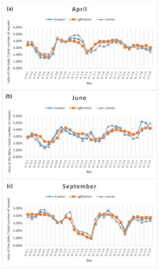 For Chinese fishing vessels (Figure 18), we found that in April and September, the change trend in the daily number was quite consistent for the trawlers, gillnetters and seiners, while there was a slight difference in June. The Chinese vessels showed little weekly variation but were influenced by traditional Chinese festivals. In China in 5 April 2018 was Tomb Sweeping Day (the holiday period was from 5 to 7 April), and 18 June was the Dragon Boat Festival (the holiday time was from 16 to 18 June), and 24 September was the Mid-Autumn Festival (the holiday time was from 22 to 24 September). We counted the proportion of the average fishing vessels per day in the total number of the month during the holiday, and for three days before and after the holiday. It can be seen from the statistics that the number of all three types decreased very significantly during the festivals, as detailed in Table 9. Interestingly, from Figure 18 we found that the number of fishing vessels was lower during the festival and the day before and after the festival, which did not correspond to the legal three-day holiday. For example, during the Tomb Sweeping Day in April, the number of fishing vessels was low from April 4 to April 6, but the number on April 7 showed a significant increase, although it was still within the legal holiday. Meanwhile, the number of fishing vessels rose to a small peak before the holiday, and then began to show a significant downward trend. This showed that, owing to the increased demand for fish during the holiday, fishermen increased their working hours before the holidays to increase their catches and returned to the port for their vacation when the festivals were approaching.