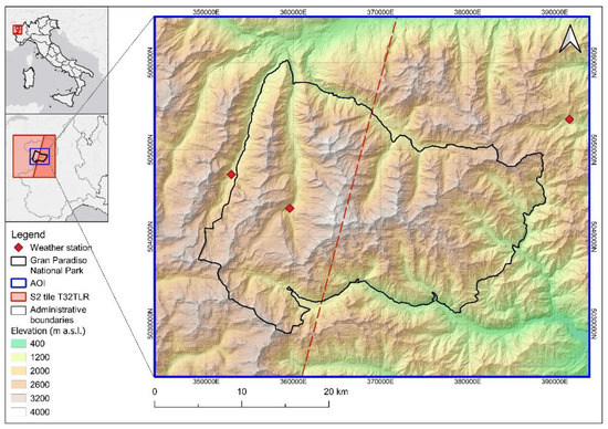 Location and elevation distribution of the Gran Paradiso National Park. Red points indicate the weather stations distributed across the Area of Interest (AOI).
