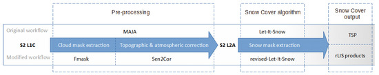 Representation and comparison of the original workflow (above), implemented for the production of the operational Theia Snow Products (TSP) [27] and the proposed revised version (below).