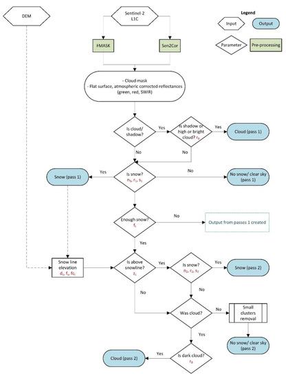 Flow chart of the revised Let-It-Snow (rLIS) algorithm. The parameters described in Table 3 are shown in red. Readapted from Gascoin et al. [35].