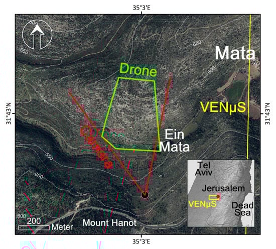 Mata research site overview map; red lines represent the field of view of the ground camera, with a black dot indicating the location of the camera; the green polygon represents the extent of the UAV mosaics; and the yellow polygon represents part of VENμS S01 tile (appearing in the inset map) which overlaps the research area.