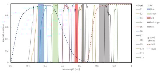 The spectral bands of the three sensors: UAV (16 bit), VENμS (16 bit), and ground photos (8 bit).