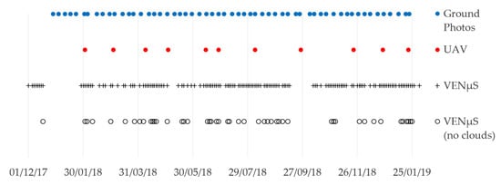 Data availability of ground photos, UAV and VENμS acquisitions in the research area, between December 2017 and January 2019.