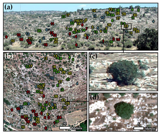 Identification of four different woody Mediterranean species at the individual plant level. Palestine oak in yellow, Terebinth in red, Mastic in green, and Carob in blue, over true color ground photo (a) and the 14 cm true color UAV mosaic (b), which were both acquired on 6 August 2018 at Mata. The two photos on the bottom right present an individual oak tree as acquired by the ground camera (c) and the UAV (d).