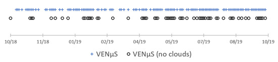 Data availability of VENμS for the TimeSat pixel-based analysis of seasonality. The first (NDVI) date was produced as an average of two neighbor clear dates (11 September 2018 and 29 October 2018).