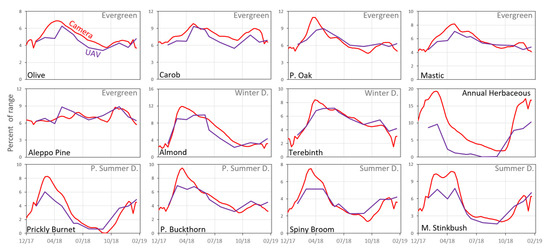 A visual comparison between the standardized ExG mean values of the UAV and the ground camera data enabled examination of the similarities and differences between the temporal patterns of the species’ VIs (Figure 7). Overall, most species presented similar dynamics between the sources; however, unlike the ground camera results, the results from the UAV for Aleppo Pine (evergreen) presented a pattern with steep changes over time (Figure 7). Moreover, the UAVs’ Palestine Oak and Olive tree (evergreen), Common Almond and Terebinth (winter deciduous), Palestine Buckthorn (partial summer deciduous) and Spiny Broom (summer deciduous), exhibited a lag between their maximum values in the UAV data compared to the ground camera data. The herbaceous vegetation was the only case where the UAV values were significantly lower than those of the ground camera (until the autumn months). Similar to the herbaceous vegetation, the summer deciduous species (full and partial) showed an earlier increase in values at the end of summer in the UAV data compared to the ground camera data, although this may be due to a gap in UAV samples (UAV acquisitions) during October 2018.