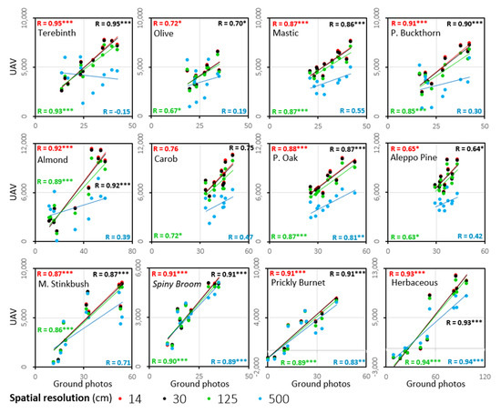 Scatter plots showing the correlations between the ExG mean values from the ground photos time series (x-axis) and from the UAV (11 dates), at pixel sizes (cm) of 14 (red), 30 (black), 125 (green), and 500 (blue). The colors of the linear trend lines correspond to the pixel sizes colors in the diagram. The asterisks represent the statistical significance of the correlations: *** p < 0.01, ** p < 0.01, * p < 0.05.
