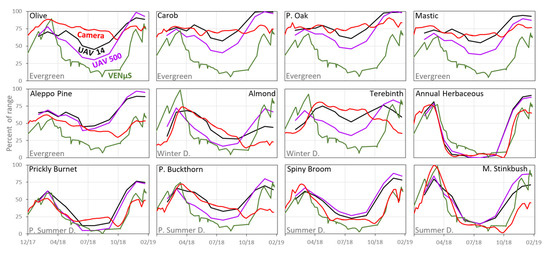 In contrast to the high correlation obtained between the ground camera and UAV in visible light indices (Table 6), comparing these sensors to VENµS yielded better results for indices containing infrared bands (NDVI, NDVIre) (Table 5). However, as stated, descriptively the general VI patterns derived from VENµS showed low variance between species, and the improvement in correlation (i.e., R > 0.7) was obtained mainly for summer deciduous species (but also for Aleppo Pine, R = 0.9, p < 0.001) (Table 5). Therefore, it seems that the red edge range in VENµS (5 m) did not make a significant contribution to the description of the phenology of woody Mediterranean species, and therefore for detailed mapping.