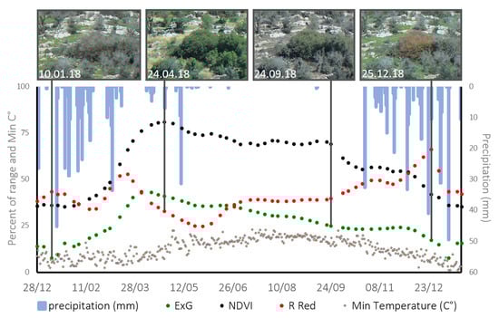 Standardized mean ExG (green), NDVI (black) and Relative Red (red) of Terebinth (n = 32), based on the ground photos after preprocessing. The left y-axis represents the index mean value as a percent of the range of values, and the daily minimum air temperature (C°, grey dots), recorded at Israeli Meteorological Service station #7220 (Netiv HaLamed-Heh, located about 7 km west of Mata). The right y-axis represents the daily precipitation (mm, blue bars), recorded at Israeli Meteorological Service station #246630 (Tzur Hadassah, located about 4.5 km east of Mata).