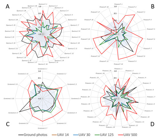 As mentioned, the ground camera data served as a reference system to which we compared the data from the other sensors. Overall, in most species, ExG had the highest correlation between the mean VI value of the ground camera (after pre-processing) and the UAV (pixel size 14 cm) (Table 4). However, some species showed a higher correlation between the sensors in other indices, such as Aleppo Pine (in relative blue), Olive tree (in relative red), herbaceous vegetation (in NDVI), and Prickly Burnet (in GRVI).