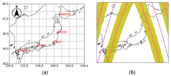 As a preliminary step for the subsequent virtual experiment in flood monitoring using the designed SAR small-satellite constellation, we sought the appropriate T/P/F parameter settings in the WC method. Although the potential combinations of these parameters are finite (assuming that F is an integer number), predetermination of the parameter setting that is likely to perform well for each T is advisable to ensure effective analysis. Thus, revisit rates and revisit time were assessed for all combinations of T/P/F for each T. Here, we provisionally tried to determine the settings of T that were likely to accomplish the revisit time in the order of one to several hours. To investigate the area to be observed by each SAR small-satellite constellation, the mapping of observable range L along the satellites’ passes was simulated for the period of the recurrent days—18 days in this case—as listed in Table 1. Then, several representative points were prepared to check the observation timings. We named these points ground check points (GCPs) and set GCPs at five locations in Japan: Sapporo, Sendai, Tokyo, Osaka, and Fukuoka, whose locations are depicted in Figure 2 (left). Figure 2 (right) presents an example of the ground tracks of satellites (purple line), observable range L (yellow belt zone), and swath width (orange belt zone) both in an ascending pass and a descending pass. The revisit rates and revisit time can be calculated by extracting the date and time when the observable zone catches the GCPs. Because the calculation period was set at 18 days, the daily revisit rates at each GCP was calculated by dividing the total number of observations for that point by 18. For the revisit time, the mean revisit time was calculated by averaging the time interval between observations for all GCPs and the maximum revisit time was calculated by extracting the largest time interval between observations for all GCPs.