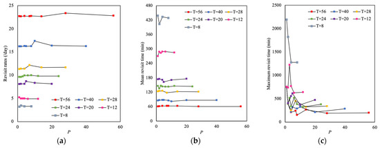 To assess the difference between the parameter settings of P and F, the revisit rates, the mean revisit time, and the maximum revisit time as a function of P for each number of T were set as shown in Figure 3. Here, the optimal parameter setting of F was set for each P, so the figure allows us to evaluate the parameter settings of T/P/F that yield the best performance in terms of revisit rates, mean revisit time, and maximum revisit time when the number of satellites (T) is given. As these results indicate, the revisit rates and mean revisit time remain almost unchanged with the variation of P, while the maximum revisit time exhibits different behavior that roughly improves as P increases. Based on these results, Table 2 lists the best parameter settings of P and F for the revisit rates, the mean revisit time, and the maximum revisit time, which are for each T the largest one in Figure 3a, the shortest one in Figure 3b, and the shortest one in Figure 3c, respectively. As shown in Table 2, for revisit rates and mean revisit time, the product of these two values nearly equals to 24 h. It was also found that the optimal settings of P and F are mostly the same between these two values with an exception of T = 24. This point should be more deeply examined in the further analysis with a higher number of GCPs in broad areas.