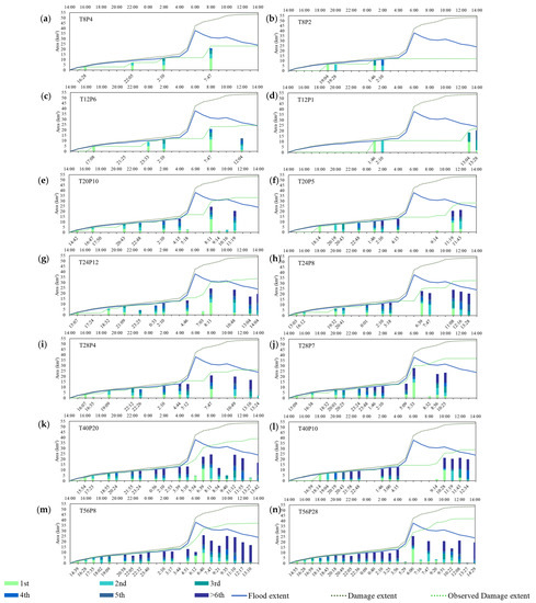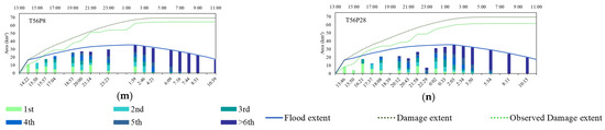 Here, we also introduced the damage extent and the observed damage extent. Damage extent was defined as the area that had experienced flooding up to each time in this event, so it was assumed to have already been damaged. In other words, the damage extent is the cumulative flood extent, including the area where flood water has already receded. Observed damage extent denotes how much damage extent area was acquired as a result of multiple observations until each time. This is calculated as the summation of the ‘1st’ first area until each time because it gives the cumulative observed flood extent with no redundancy. Comparison of the two dotted lines of damage extent and observed damage extent demonstrates the extent to which the observation system can trace the real situation on a spatial and temporal scale. Figure 5 presents the results for case 2 (Typhoon No. 19 from 13:00 on 12 October 2019 to 11:00 on 13 October 2019). Here, the definition of legends is the same as that in Figure 4.