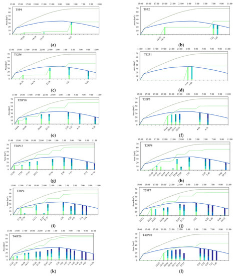 The calculation result of the capture ratio in case 1 and case 2 is presented in Table 3. Here, the result of one large satellite (T = 1) is also shown beside that of T = 8, 12, 20, 24, 28, 40, and 56. As can be seen from this table, the capture ratio usually grew higher as the number of T increased, but it varied with the number of P even under the same number of T, and sometimes the smaller number of T has a better result for the capture ratio. This implies that the number of satellites (= T) is of course a dominant parameter that determines observation performance, but the configuration of satellite constellation (= T/P/F) should be also carefully selected. This performance index, the capture ratio, allows us to compare the result of multiple case studies. When we focus on the difference between case 1 and case 2, it can be seen that in case 1 more than 56 satellites are required to achieve 81% acquisition, while even 20 satellites accomplish 87% in case 2. This is considered to be mainly because of the characteristics of each flood event. In case 1, the peak flooding was happening in a short time, which means flood extent was expanding and shrinking quickly. Thus, if the observation timing was missed or the observed area was insufficient in that peak time, data acquisition would be difficult to recover. On the other hand, in case 2, the flood was gradually expanding and shrinking, so it was easier to capture most of the damage extent during that period. This result demonstrated that observation performance is fairly dependent on temporal and spatial flood fluctuation in each event. As another interesting point, in fact, the whole area of damage extent was larger in case 2 (69.49 km2) than that in case 1 (53.82 km2), but the capture ratio was generally higher in case 2, so it seems unnatural. This is because there is a water channel network unique to the region (Saga city) in case 1. Due to that geographical feature, the flood extent was distributed more widely, but the total area resulted in a smaller value, which means it was difficult to capture the whole area of flood extent at one time (but conversely it provided more opportunities to observe a part of the flood extent). This kind of flood feature also impacted on the observation performance.