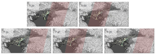 In both cases 1 and 2, the observed flood extent in some instances was insufficient relative to the flood extent at each time. To investigate this issue, Figure 6 presents the captured flood extent with the constellation of T = 56, P = 28 in case 1. The red zone represents the observed extent, whose swath width is 30 km. Here, it is clear that the observed area did not always match the flood area—for example, at 5:29, 7:16, and 9:20—and this discrepancy caused insufficient data acquisition. This is generally attributable to two factors. The first factor is the suitability of satellite passes: satellites do not always pass over an appropriate location with respect to each area of interest, so they are sometimes unable to capture it well. This is related to the second factor, which is the limited range of SAR’s incidence angles. The look direction of a SAR instrument cannot be adjusted in all ranges, and this restriction prevents flexible operation according to the target area.
