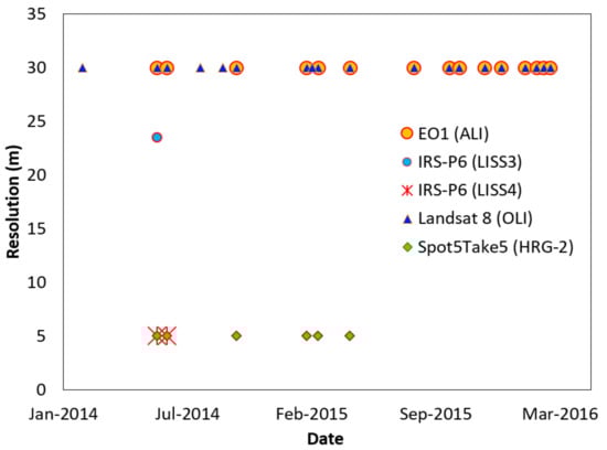 Clouds are the greatest obstacle to using the images from the same satellite for an entire study period. To address the unavailability of time-series images from the same satellite due to cloud cover, we obtained optical images from several platforms, including LS8, S5T5, EO1-ALI, and the Indian Remote Sensing (IRS) satellite IRS-P6 (Figure 2). LS8 OLI images, EO1-ALI images, High Resolution Geometrical sensor images from S5T5, and Linear Imaging Self Scanning Sensor (LISS-3 and LISS-4) images from IRS-P6 (Resourcesat-2) were obtained from the summer season of 2014 to that of 2016. All images obtained were pre-processed for atmospheric correction using the Second Simulation of a Satellite Signal in the Solar Spectrum [,,] radiative transfer model, followed by a geometric correction. A total of 43 optical satellite cloud-free images from multiple platforms were obtained (Figure 2).