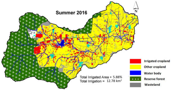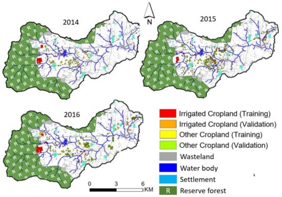 However, monitoring field-scale groundwater-irrigated cropland for multiple cropping seasons requires high spatial and temporal resolution time-series images [,,]. This study aimed to use freely available high spatial and temporal resolution optical satellite images to monitor irrigated cropland. Optical satellite payloads such as Landsat-8 (LS8), Sentinel-2 (S2), Earth Observation-1 Advanced Land Imager (EO1-ALI), and Spot-5 Take-5 (S5T5) with a spatial resolution of 30, 10, 30, and 5 m, respectively, are available free of charge for research purposes [,,,]. This study developed a method to classify field-scale irrigated cropland for the three cropping seasons (summer, kharif, and rabi) of 2014–2016 in a watershed of southern peninsular India. We used all available cloud-free optical satellite images for the analysis and performed intensive ground observation simultaneously. The field-scale linear relation between mean NDVI estimated from LS8 Operational Land Imager (OLI) and other optical satellite products was calculated before combining several NDVI products. These individual NDVI products were then used to calculate cumulative seasonal NDVI at the field scale. These seasonal normalized cumulative NDVI products identified intensification of irrigation with high values. Then, we applied a support vector machine (SVM) classification to these products and validated the results using ground observations.