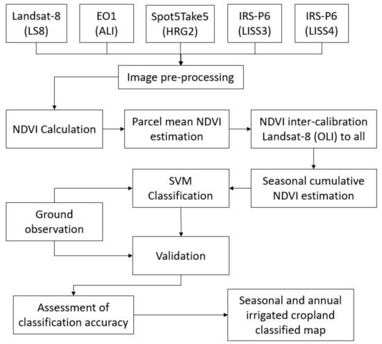 Flowchart of the developed method. Abbreviations used in the figure are as follows: EO1, Earth Observing-1; ALI, Advanced Land Imager; IRS-P6, Indian Remote-Sensing Satellite-P6 also known as ResourceSat-1; LISS3, Linear Imaging Self Scanning Sensor-3; LISS4, Linear Imaging Self Scanning Sensor-4; OLI, Operational Land Imager; HRG-2, High Resolution Geometric-2; SVM, Support Vector Machine; NDVI, Normalized Differential Vegetation Index.