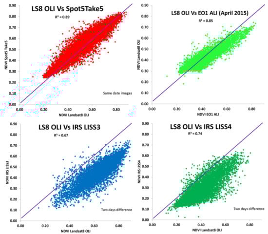 The linear regression equations were applied to the NDVI datasets derived from the other satellite images (EO1 (ALI); Spot5Take5; IRS-P6 (LISS3); IRS-P6 (LISS4)). Equations (1)–(4) represent the equations obtained from linear regression between NDVI values obtained from Landsat-8 (OLI) and other satellite datasets. These equations were further implemented over other satellite datasets to calculate refined NDVI images.