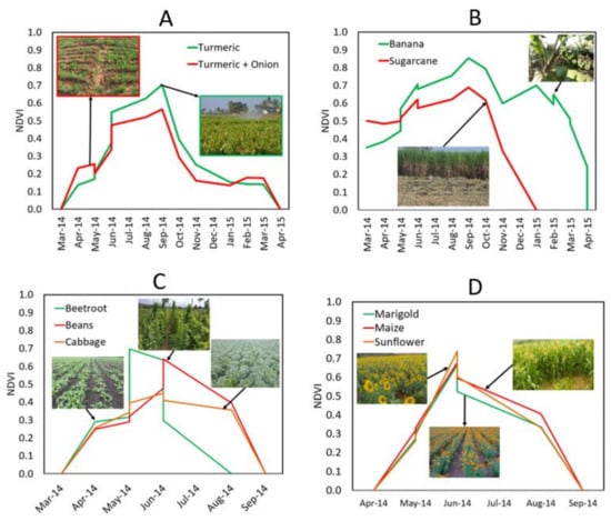 The corrected NDVI, presented in Figure 7 as a temporal crop growth curve, can be used to precisely identify the sowing and harvesting times of irrigated and non-irrigated crops. Sugarcane and banana, which are annual crops, were harvested, respectively, in the rabi season (January) and at the end of the summer season (April). When the onion was cultivated with turmeric, it became mature in about two months and showed a peak in May followed by harvesting. Short duration (~90 days) irrigated crops (beetroot, beans, cabbage) matured in May or June and were harvested at the end of the kharif season (August or September). Non-irrigated crops (marigold, maize, sunflower) were planted in April, matured in June, and were harvested in September. Marigold flower harvesting started immediately after maturation, showing a high decrease in NDVI.