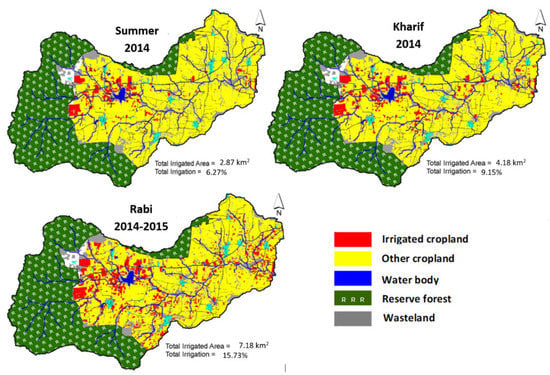 Irrigation of croplands intensified in the upstream areas in all 2015–2016 cropping seasons. The intensity of irrigated croplands followed the main drainage network of the watershed (Figure 10). More than 500 mm of rainfall during the 2014–2015 kharif and summer cropping seasons recharged the groundwater, which motivated farmers to irrigate in the 2015 summer cropping season. Upstream (near forest reserves) and downstream farmers performed intensive irrigation in the 2015 summer season (Figure 10). The upstream farmers between the national reserve forest and the watershed’s main water body performed intensive irrigation practices in all three cropping seasons.