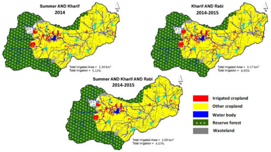 Irrigated croplands in the 2015–2016 cropping seasons (Table 3) were relatively more common than in 2014–2015 (Table 3). For the 2015–2016 summer, kharif, and rabi seasons, 15.9%, 16.5%, and 14.0% of croplands were intensively irrigated. Overall, 10.6% of cropland was irrigated in both the 2015 summer and kharif seasons. Similarly, 9.4% of cropland was irrigated in both the kharif and rabi seasons. Annually irrigated croplands occupied about 7.3% of cropland in the watershed.