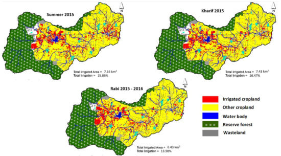 The number of spatially distributed annually irrigated samples was kept large in order to validate the developed method’s ability to classify seasonal irrigated cropland. The total irrigated area for the 2015 rabi season was estimated at 14% and 12.7% for the 2016 summer season.