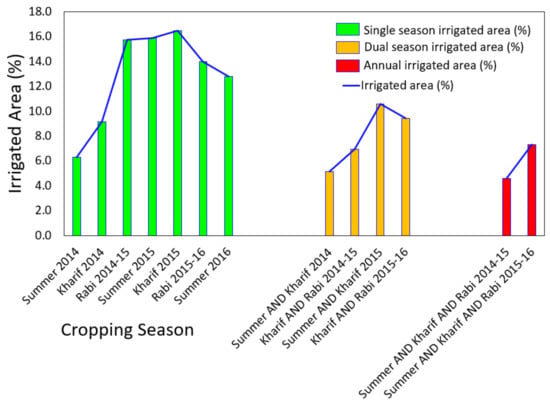 Representation of irrigated area percentage during various single cropping seasons, dual cropping seasons, and all cropping seasons.