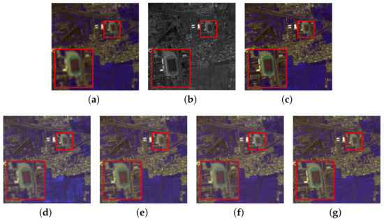 Comparison results of different attention strategies (downsampled GF-2 image of Henan Province, China). (a) LRMS image. (b) HRPAN image. (c) Reference MS image. (d–g) Pansharpening result of plain network, encoder attention, fusion attention and the proposed method.