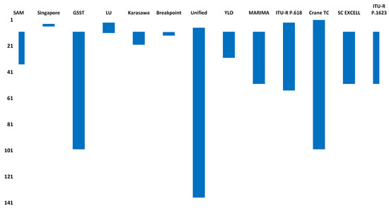 The rain attenuation prediction requires long-term local rainfall rate information. However, in all parts of the world, such rainfall rate datasets are not available. In addition, even though the rainfall rate or rain attenuation datasets are recorded for a specific experimental setup, some parts of the dataset might be missing. To address these issues, a rainfall rate or attenuation time series needs to be generated. Fortunately, there are techniques available such as the synthetic storm technique (SST) [63] and enhanced synthetic storm technique (ESST) [64], and 2-D SST [65]. Rain attenuation prediction models such as the global synthetic storm technique (GSST) model [66] and the ESST model [64] use such types of time series generation procedures. Through applying such a procedure, as stated earlier, the missing datasets of any local climate can be generated.