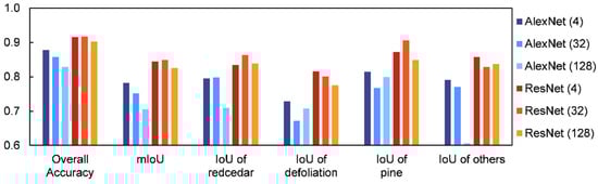 AlexNet and ResNet algorithms’ performances with different numbers of batch size (i.e., 4, 32, 128). ResNet algorithms gained higher performance than AlexNet, while algorithms with small batch size gained higher performance than those with large batch size. Pine class gained the highest IoU, while defoliation class gained lowest IoU.