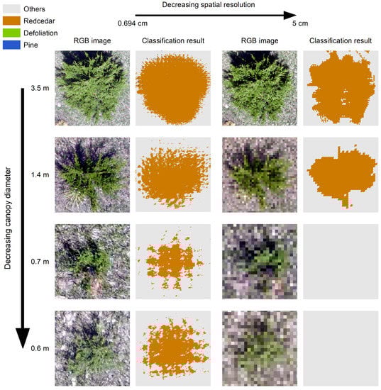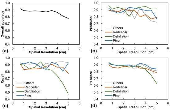 The segmentation performance with UAS images in various down-sampled spatial resolutions for different classes was presented with precision, recall, and F1 score (Figure 4). In general, precision ranged from 0.720 to 0.961 for the four classes with UAS images in various spatial resolutions. For individual class, precision for the others class decreased, and that of the redcedar class had an obvious decrease. The decreasing trend meant more samples of defoliation or pine classes were predicted as others or redcedar class in images of coarser spatial resolutions. The precision of defoliation and pine classes had no obvious increasing or decreasing trend with UAS images in various spatial resolutions. In general, recall ranged from 0.476 to 0.945 for the four classes. For individual class, recall of defoliation class decreased quickly, which meant more samples of defoliation class were predicted as other classes with coarser spatial resolution images. Others class had the highest recall value among the four classes with images in nearly all spatial resolutions. That meant the number of others class samples predicting as other classes were minimum among the four classes. Recall of redcedar and pine classes had the moderate value among the four classes.