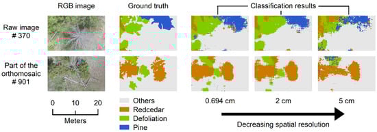 Visualization of examples of multi-species forest classification results with UAS images in original (0.694 cm) and down-sampled spatial resolutions at 2 cm, and 5 cm. The classification performance reduced as the spatial resolution decreased.