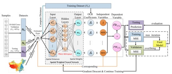 where denoted the spatial distance between point and all training points. Figure 2 illustrates the PM2.5 modeling process of GNNWR. The OLR coefficients representing the average PM2.5–AOD relationship in China were pre-calculated using the training dataset. The prediction accuracy of PM2.5 estimates was dependent on the non-linear fitting ability of SWNN, which was optimized through a grid search strategy (Supplementary Materials, SM). The neural network structure and hyper-parameters of GNNWR are shown in Table S3.