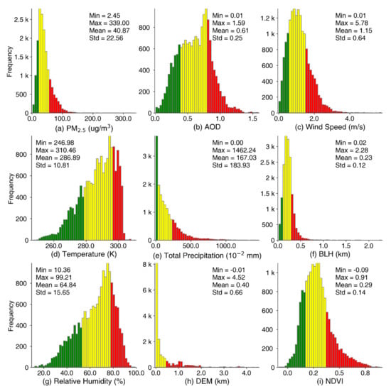 Figure 3 displays the descriptive summaries and histograms of the monthly PM2.5 measurements and auxiliary datasets. The surface PM2.5 concentrations ranged from 2.45 to 339.00 μg/m3, with a mean value of 40.87 μg/m3 and a standard deviation (Std) of 22.56 μg/m3. The histogram of PM2.5 suggested that its value was mainly concentrated in the range of 0–50 μg/m3. The VIIRS IP AOD with a mean value of 0.61 was distributed in an extent of [0.01, 1.59]. It can be noted that the histograms of PM2.5 and AOD were somewhat dissimilar, mainly because their complex associations were significantly affected by geographical, meteorological, and seasonal conditions [6].
