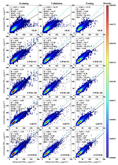 Table 1 displays the mean performance of PM2.5 estimations of monthly datasets for the OLR, GWR, GRNN and GNNWR models. Scatter plots of PM2.5 estimates versus observations among these methods are presented in Figure 4. We can see that GWR, GRNN and GNNWR models were far superior to the OLR model for all statistical indicators. Regarding the fitting performance of the 10-fold CV results, the training and validation accuracy of the GWR with adaptive bi-square kernel (GWR-AB) were better than the GWR with fixed Gaussian kernel (GWR-FG) according to the statistics of R2, RMSE, MAE and MAPE. This suggested that the adaptive kernel was more suitable than the fixed kernel to characterize the spatially non-stationary PM2.5–AOD relationship, which likely resulted from the uneven distribution of monitoring stations in China [50].