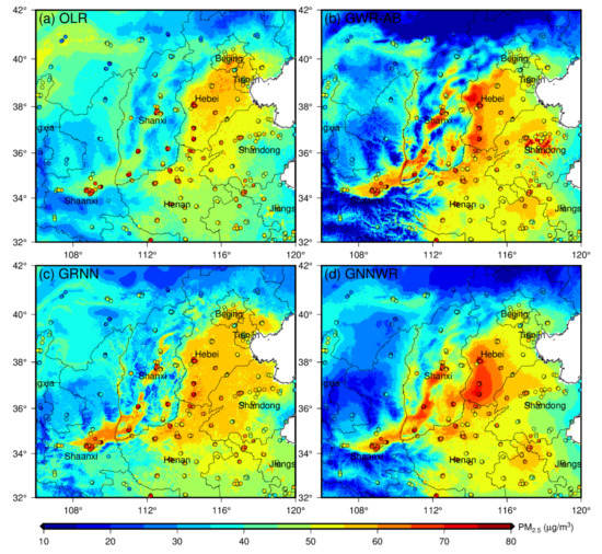 To assess the accuracy and reasonability of satellite-derived PM2.5 mappings of GNNWR, annual mean PM2.5 maps of China achieved by OLR, GWR, and GRNN are depicted for comparison (Figure S6). It can be noted that the spatial PM2.5 maps of these models were basically consistent. The OLR estimates exhibited homogenous trends in space due to its inconsideration of spatial non-stationarity while the GRNN estimates displayed some unreasonable variations in western China caused by its overfitting. Obviously, the maps of GWR-AB and GNNWR were more reasonable and coincident with the ground-level measurements. The North China Plain is a highly developed and polluted area in China and is of great concern to the public [15,61]. The satellite-derived PM2.5 estimates of these models in this area are amplified for detailed comparison (Figure 8). We can see that OLR and GRNN were unable to portray the high PM2.5 concentrations (>60 µg/m3) in heavily polluted areas due to their serious underestimation of high values. Although GWR-AB was capable of mapping high PM2.5 and displayed a better distribution than OLR and GRNN, its spatial varying pattern was too steep and showed some unreasonable distributions, such as the high-value aggregation in Shandong Province and the drastic mutation in Shanxi Province. It was clear that GNNWR has obtained highly accurate estimates and rarely exhibited unreasonable variations benefited from its excellent prediction ability.